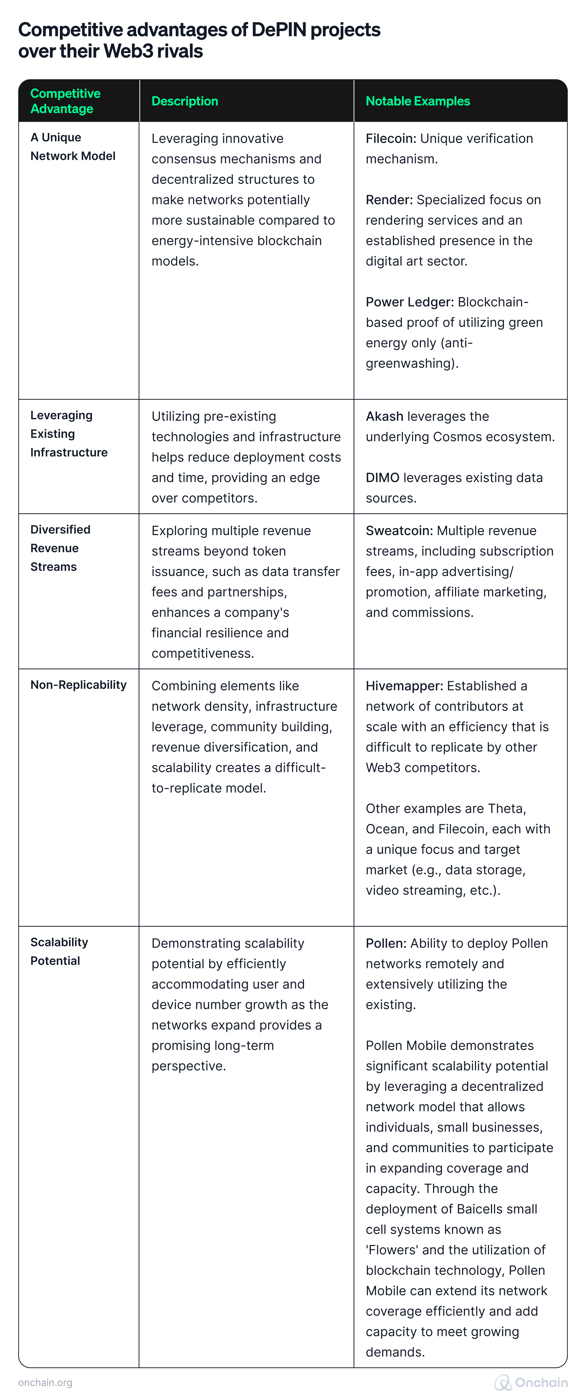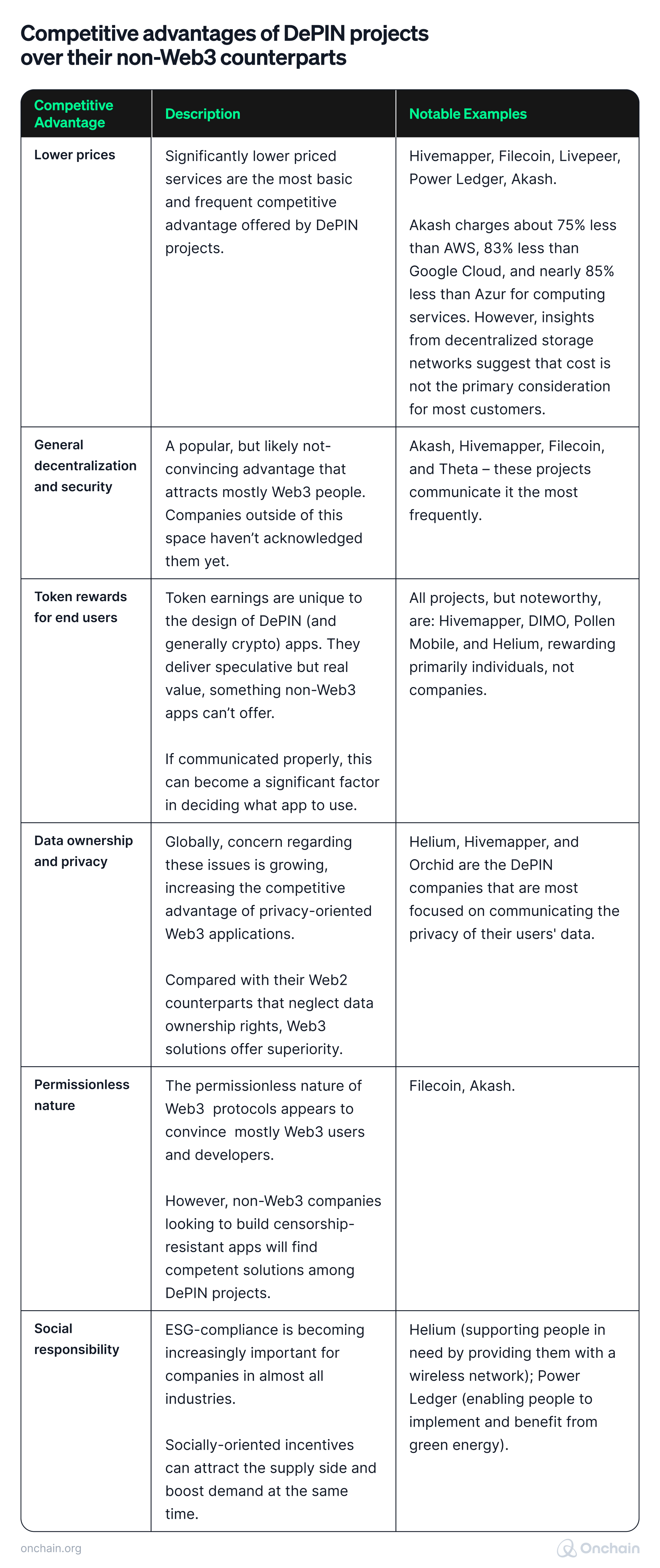 Currently, DePIN projects still focus mainly on the Web3 landscape. The idea is to prove yourself in the home court, the Web3 arena before you’re ready to venture out into the much larger market. Most DePINs emphasize the competitive advantage they have over their direct rivals.