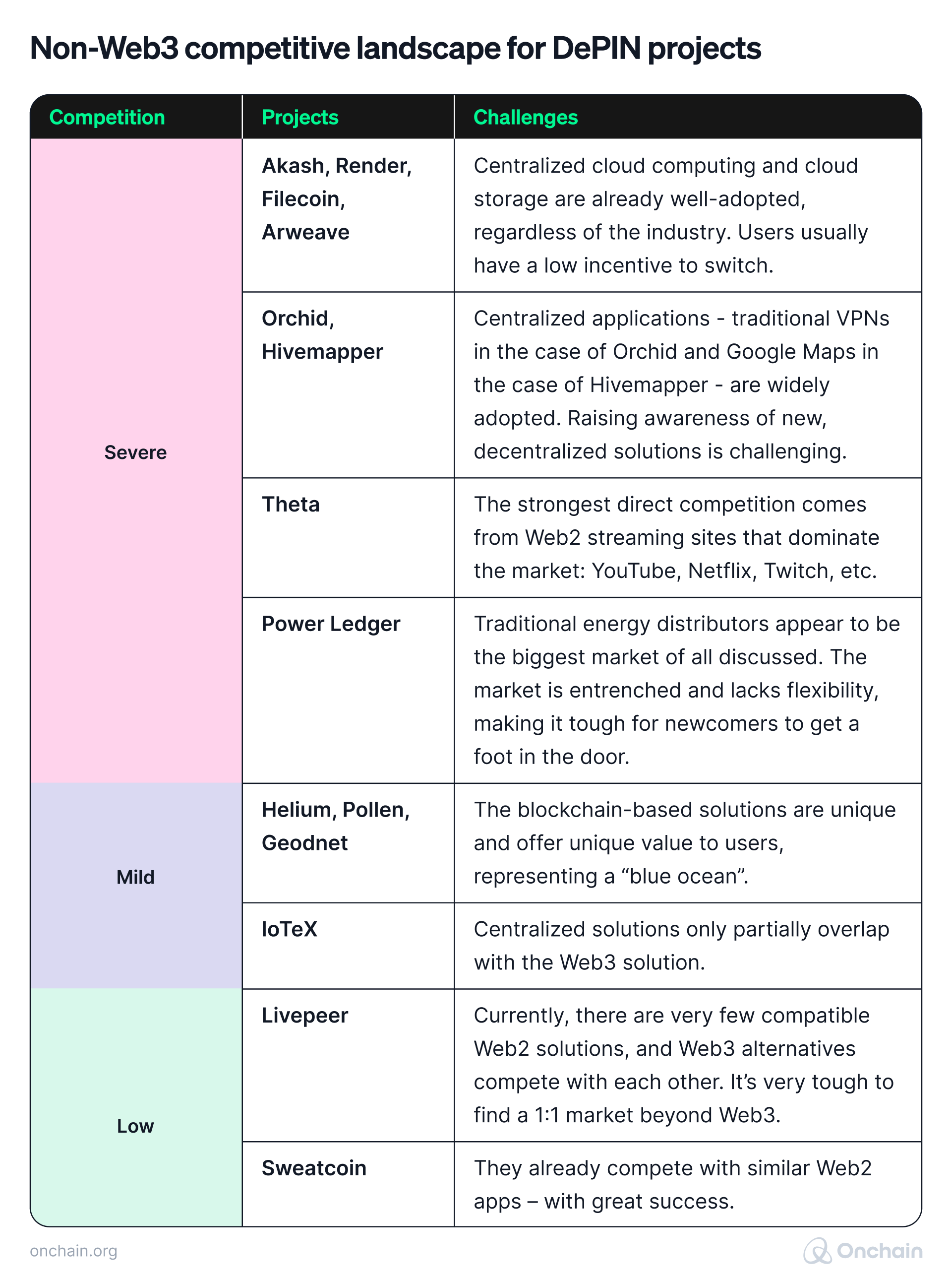 Before you get all excited now, let’s break that down a bit. In some areas, this idea is more viable than in others. Below, you’ll find a categorization of noteworthy DePIN projects based on their ability to compete with their non-Web3 counterparts.