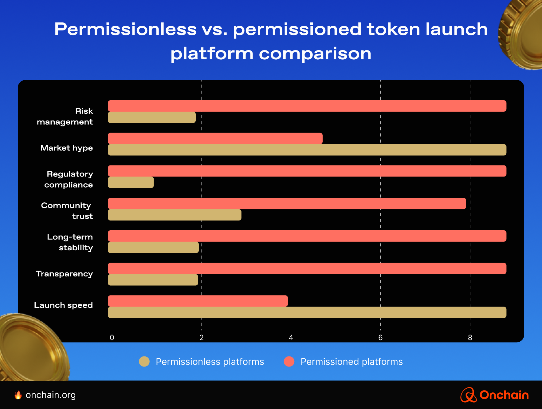 This dichotomy creates a competitive tension. The chart below compares permissionless and traditional launch platforms based on representative criteria such as risk management, market hype, etc. Each criterion is scored on a scale of 1 (Lowest) to 10 (Highest) based on real-world platform behaviors, outcomes, and qualitative assessments across major launch ecosystems (e.g., Pump.fun, Clanker, Legion, Echo, and traditional Launchpads like Coinlist) (see Chapter 2 for more details on how these platforms behave).