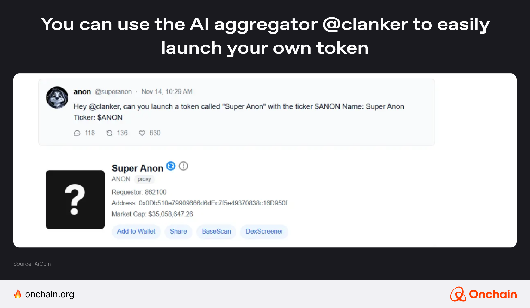 Similarly, Clanker, an AI aggregator on Base, scans user parameters including desired blockchain, token distribution, and liquidity goals before orchestrating an entire token launch lifecycle. Its user-friendly interface allows individuals to create ERC-20 tokens by simply tagging @clanker on platforms like Farcaster.