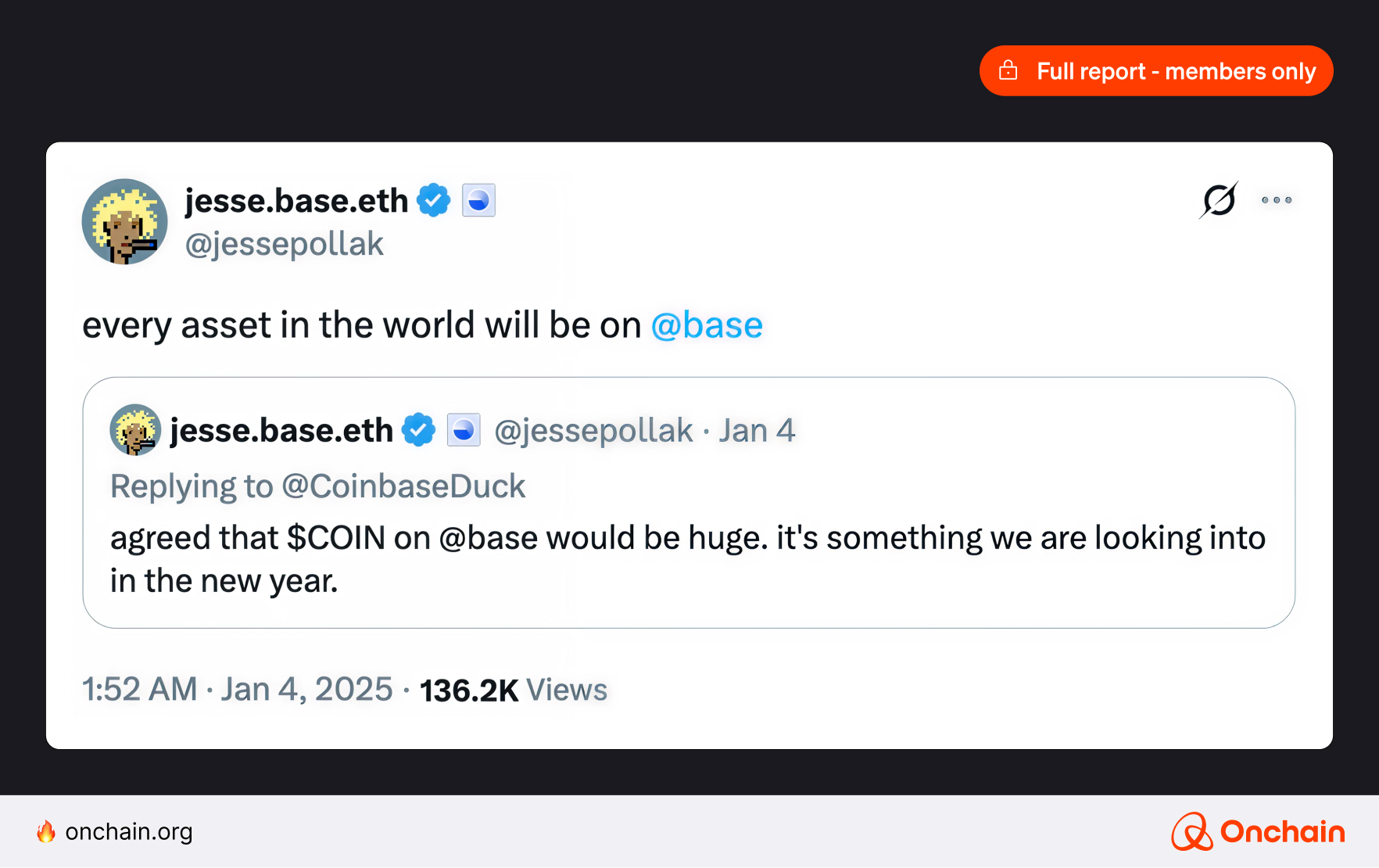 It’s still early, yet the demand is strong. Base creator Jesse Pollak promotes tokenization of “every asset in the world” on Base, starting with COIN, setting a precedent for the sector.