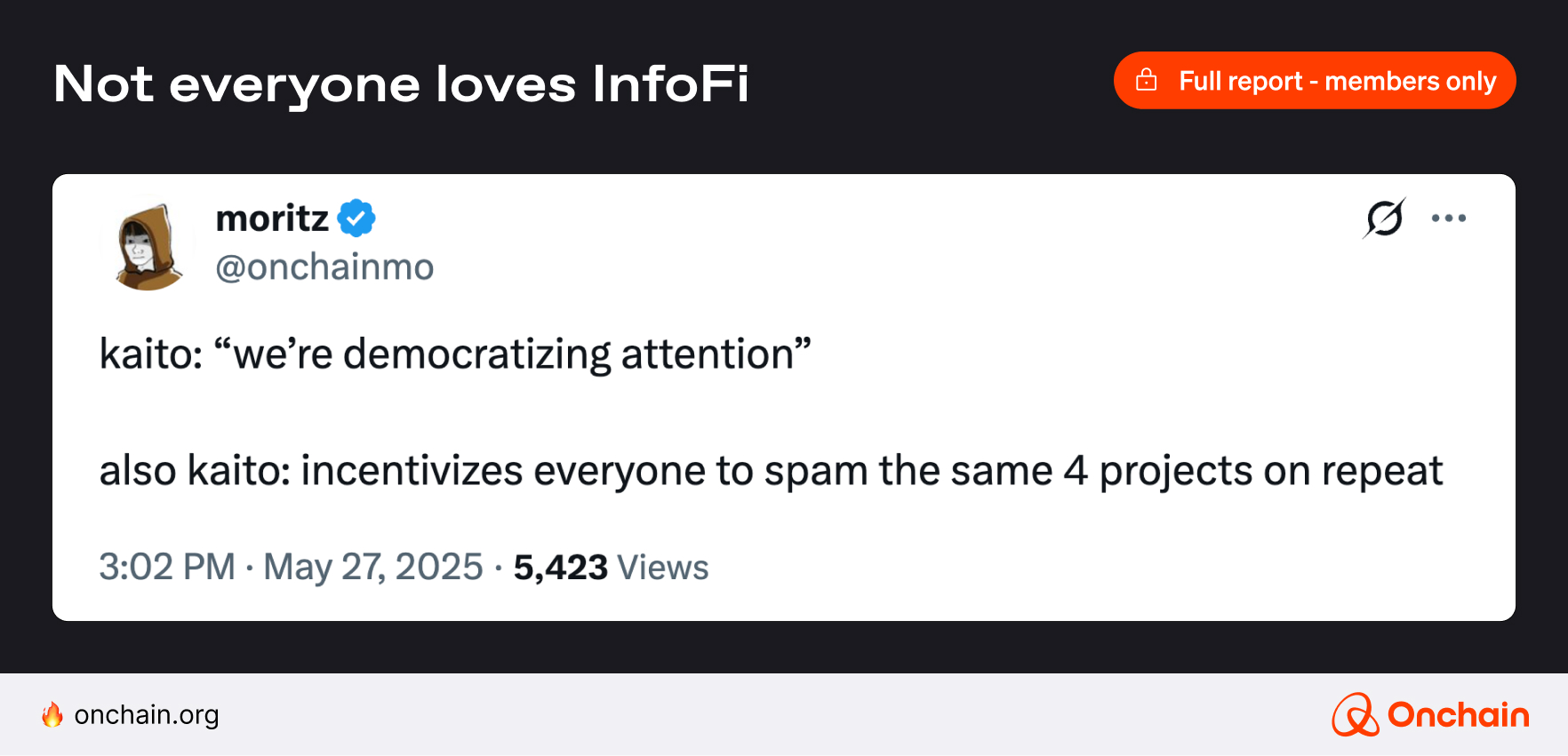 Goodhart’s law states that “when a measure becomes a target, it ceases to be a good measure”. In InfoFi’s case, that’s mindshare and influence. This raises the questions: how do we find the balance and prevent the space from turning into a breeding ground for vaporware and clout farmers?